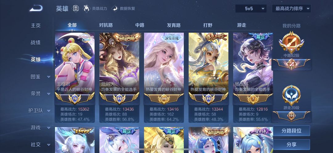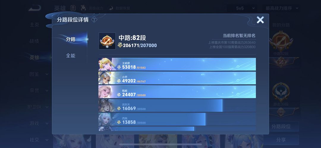 满英雄、三个小国标、二十多个金标、可打排位、无禁言、历史百星、中路八十二段、荣耀印记19次。