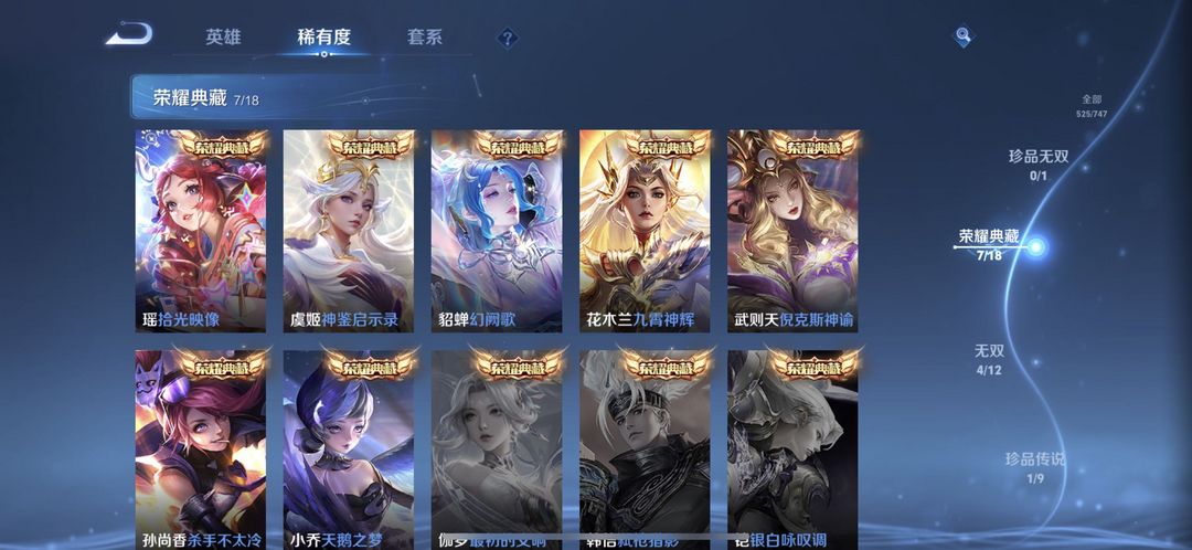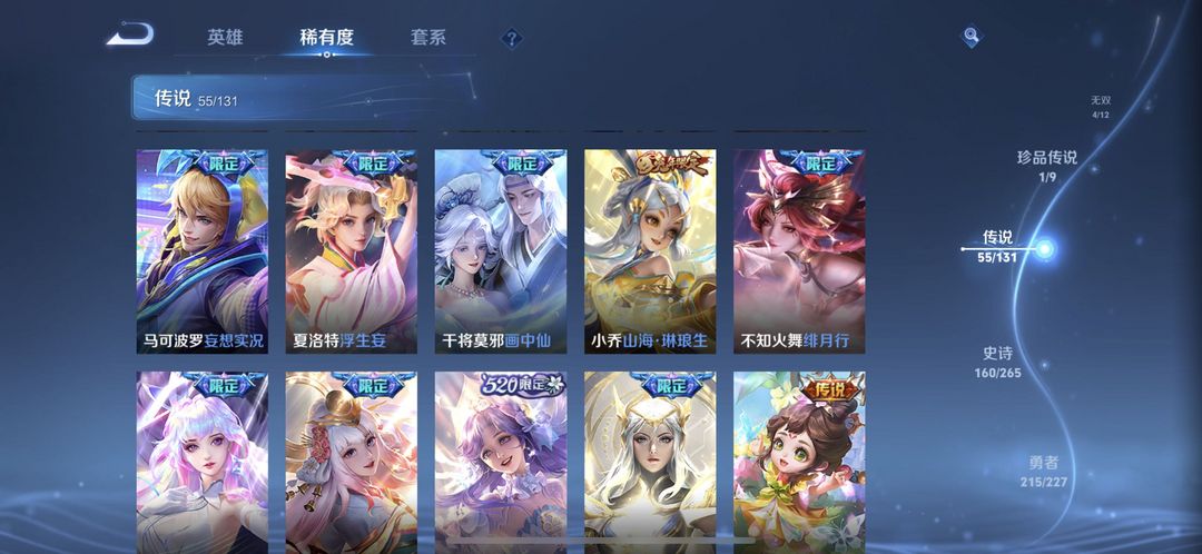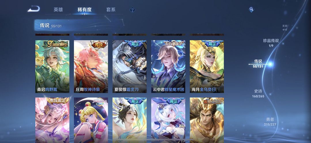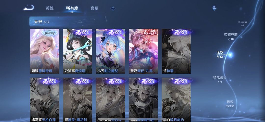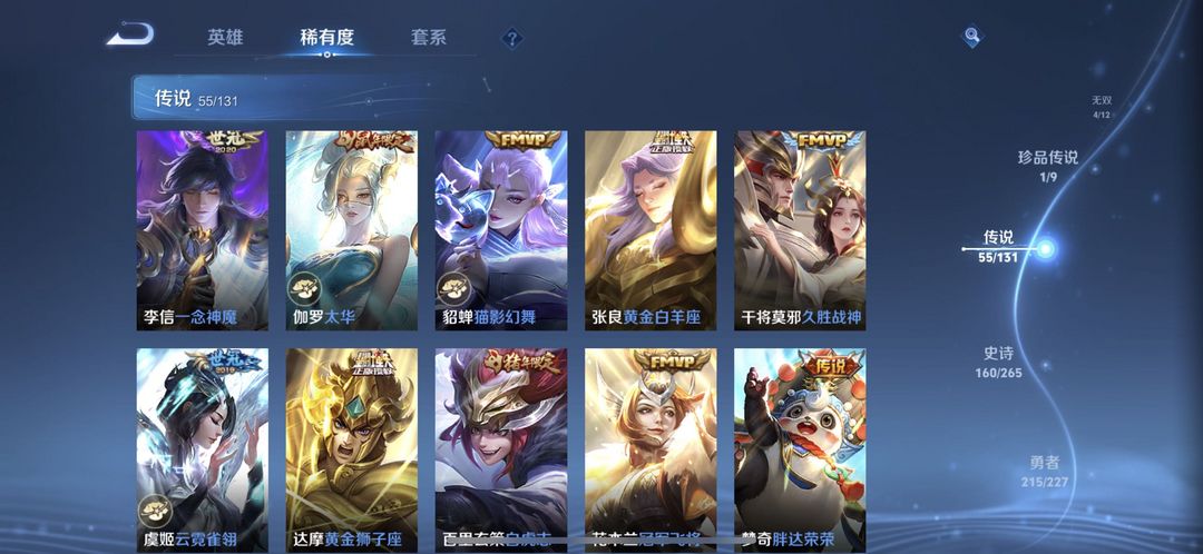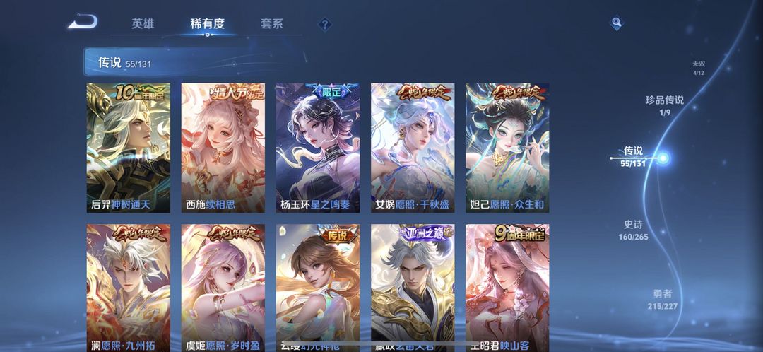 七款典藏、四款无双、一款珍品传说、五十五款传说、八款星传说、一百多款优质史诗皮肤和三十多款按键皮