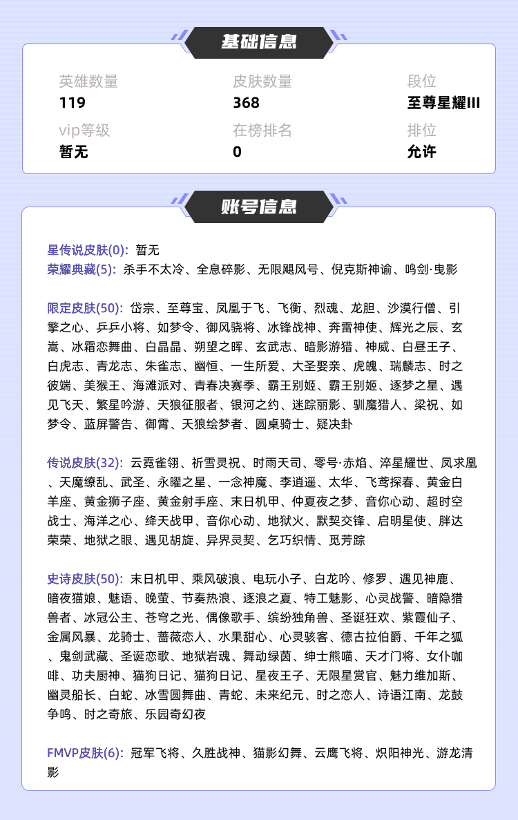 本游戏账号: ,基础段位:至尊星耀III,英雄多,皮肤多。典藏皮肤5个,感受典藏皮肤带来的优质体验快感,FMVP皮肤6个,尽情享受FMVP皮肤带来的主角光环, 私人所属英雄皮肤有:孙悟空 全息碎影||武则天 倪克斯神谕||李白 鸣剑·曳影||孙尚香 杀手不太冷||夏侯惇 无限飓风号孙悟空 零号·赤焰||孙悟空 地狱火||貂蝉 遇见胡旋||貂蝉 仲夏夜之梦||武则天 海洋之心||李白 凤求凰||孙尚香 异界灵契||孙尚香 末日机甲||吕布 天魔缭乱||兰陵王 默契交锋||曜 李逍遥||公孙离 祈雪灵祝||李信 一念神魔||杨戬 永曜之星||赵云 淬星耀世||虞姬 启明星使||虞姬 云霓雀翎||关羽 武圣||诸葛亮 时雨天司||王昭君 乞巧织情||达摩 黄金狮子座||伽罗 太华||铠 绛天战甲||宫本武藏 地狱之眼||艾琳 觅芳踪||后羿 黄金射手座||狄仁杰 超时空战士||小乔 音你心动||李元芳 飞鸢探春||张良 黄金白羊座||周瑜 音你心动||梦奇 胖达荣荣,等等