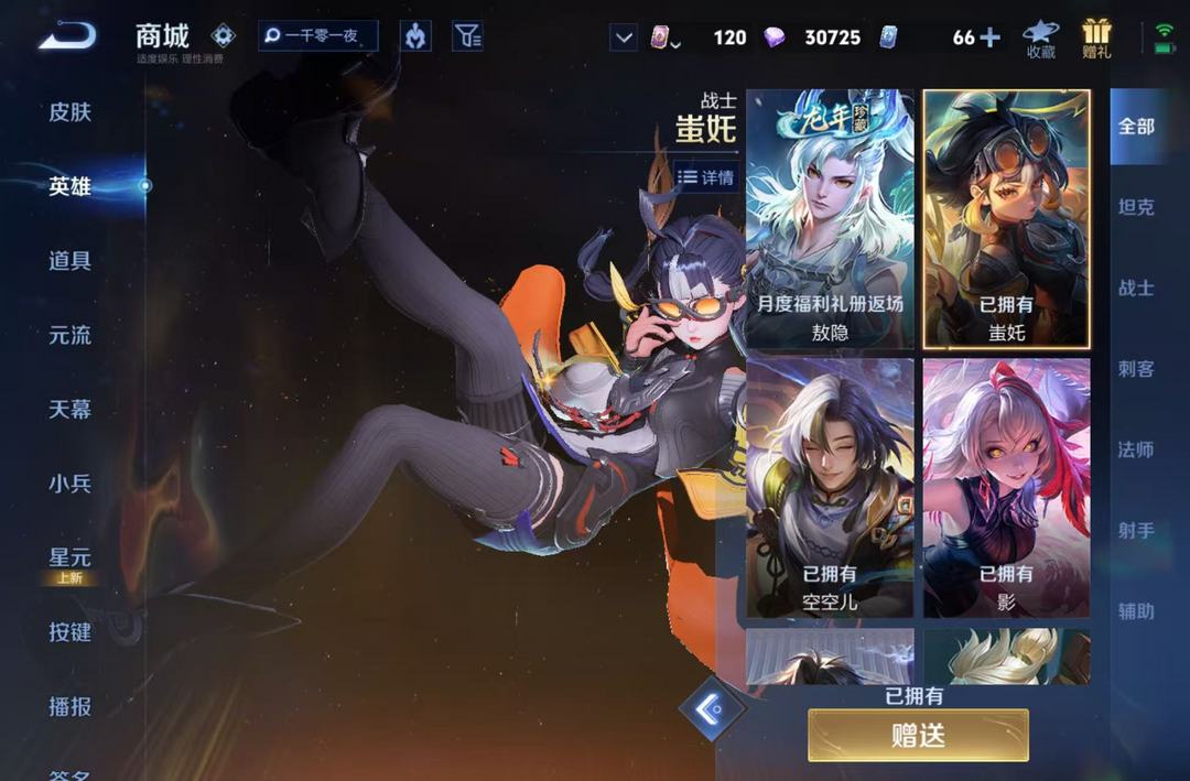 英雄:孙悟空(孙悟空 西部大镖客,孙悟空 孙行者);太乙真人(太乙真人 圆桌骑士,太乙真人 劲辣红锅);王昭君(王昭君 凤凰于飞,王昭君 精灵公主,王昭君 偶像歌手,王昭君 幻想奇妙夜,王昭君 永恒水手月亮,王昭君 午后时光);海月(海月 幻泉雾影,海月 浮梦罗烟);武则天(武则天 倪克斯神谕,武则天 海洋之心,武则天 幻海之心);赵怀真(赵怀真 太极少年);夏侯惇(夏侯惇 匿光决锋者,夏侯惇 乘风破浪,夏侯惇 战争骑士,夏侯惇 朔风刀);莱西奥(莱西奥 末日机甲,莱西奥 西部游侠);项羽(项羽 帝国元帅,项羽 苍穹之光,项羽 海滩派对,项羽 科学大爆炸);小乔(小乔 天鹅之梦,小乔 山海·琳琅生,小乔 纯白花嫁,小乔 音你心动,小乔 万圣前夜,小乔 缤纷独角兽,小乔 青蛇,小乔 丁香结);雅典娜(雅典娜 黎明之约,雅典娜 冰冠公主,雅典娜 战争女神,雅典娜 神奇女侠,雅典娜 单词大作战);亚瑟(亚瑟 心灵战警,亚瑟 死亡骑士,亚瑟 潮玩骑士王);杨戬(杨戬 潮玩骑兵,杨戬 次元傲视);杨玉环(杨玉环 寅虎·心曲,杨玉环 霓裳曲,杨玉环 遇见飞天,杨玉环 银翎春语);弈星