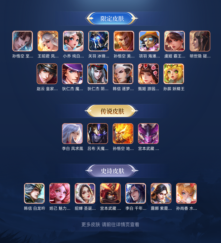 有七十多个皮肤,多套满配符文,天魔缭乱,美猴王,地狱火,花嫁,冰封战神等众多限定皮肤